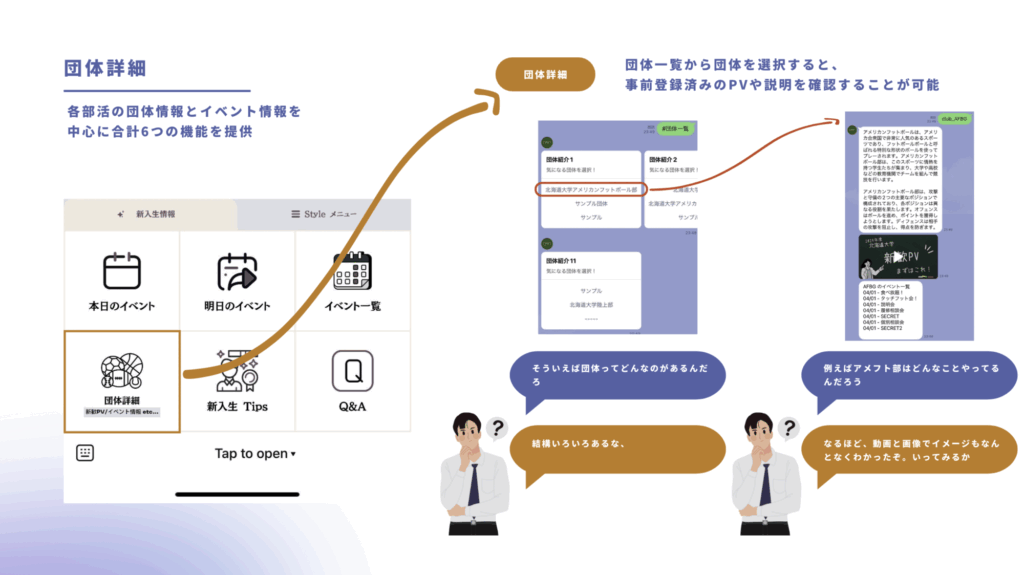- 団体詳細:団体の詳細情報や新歓動画、関連イベント
